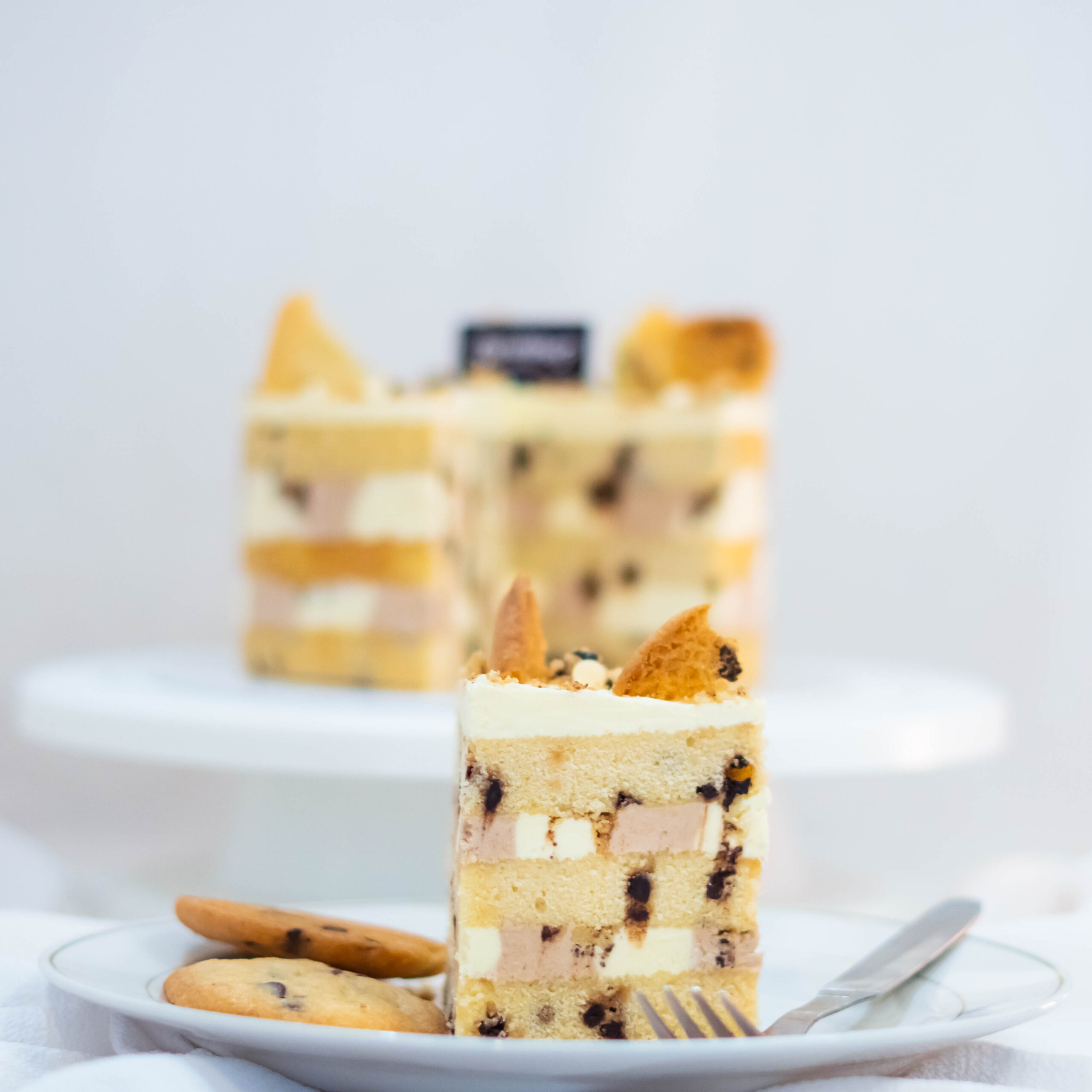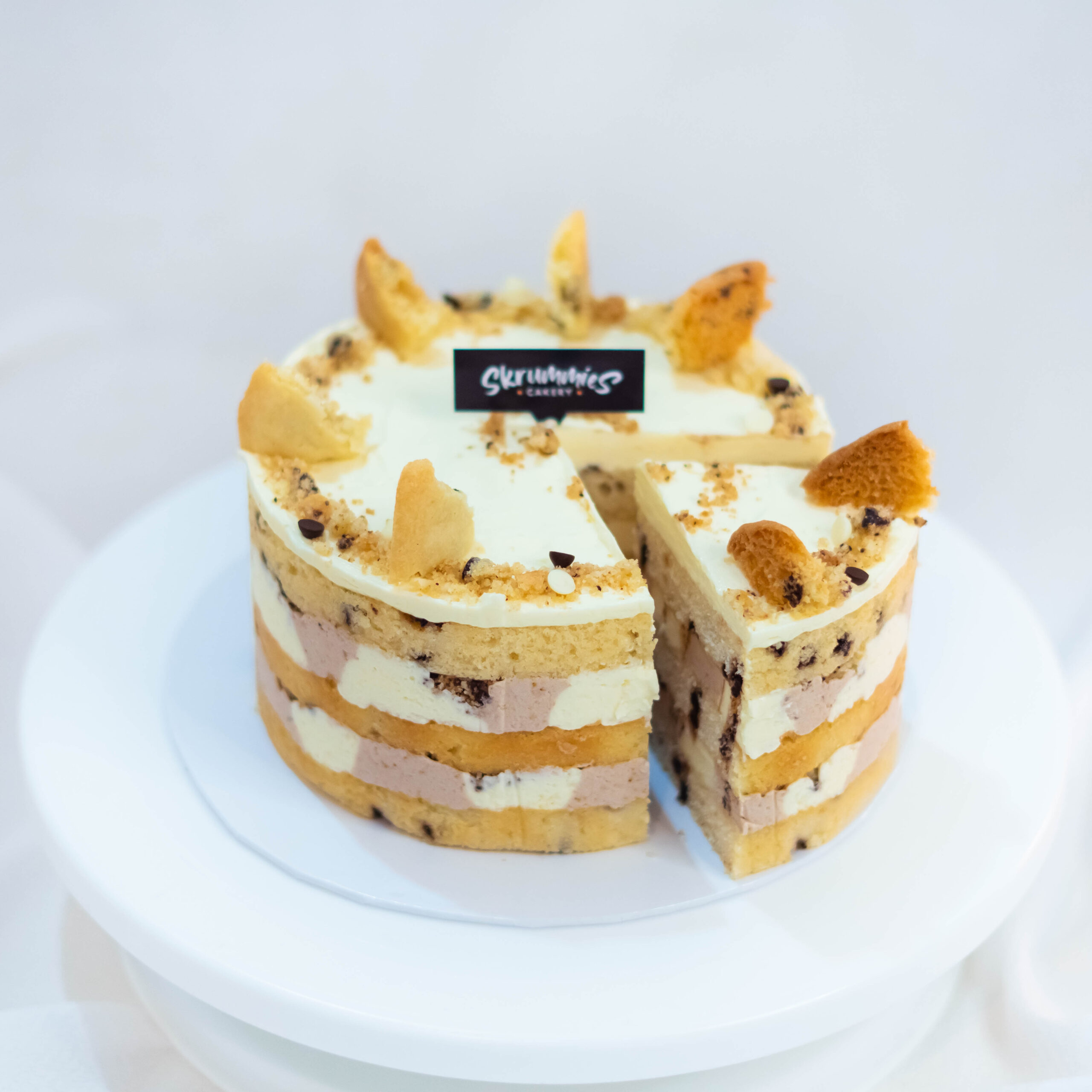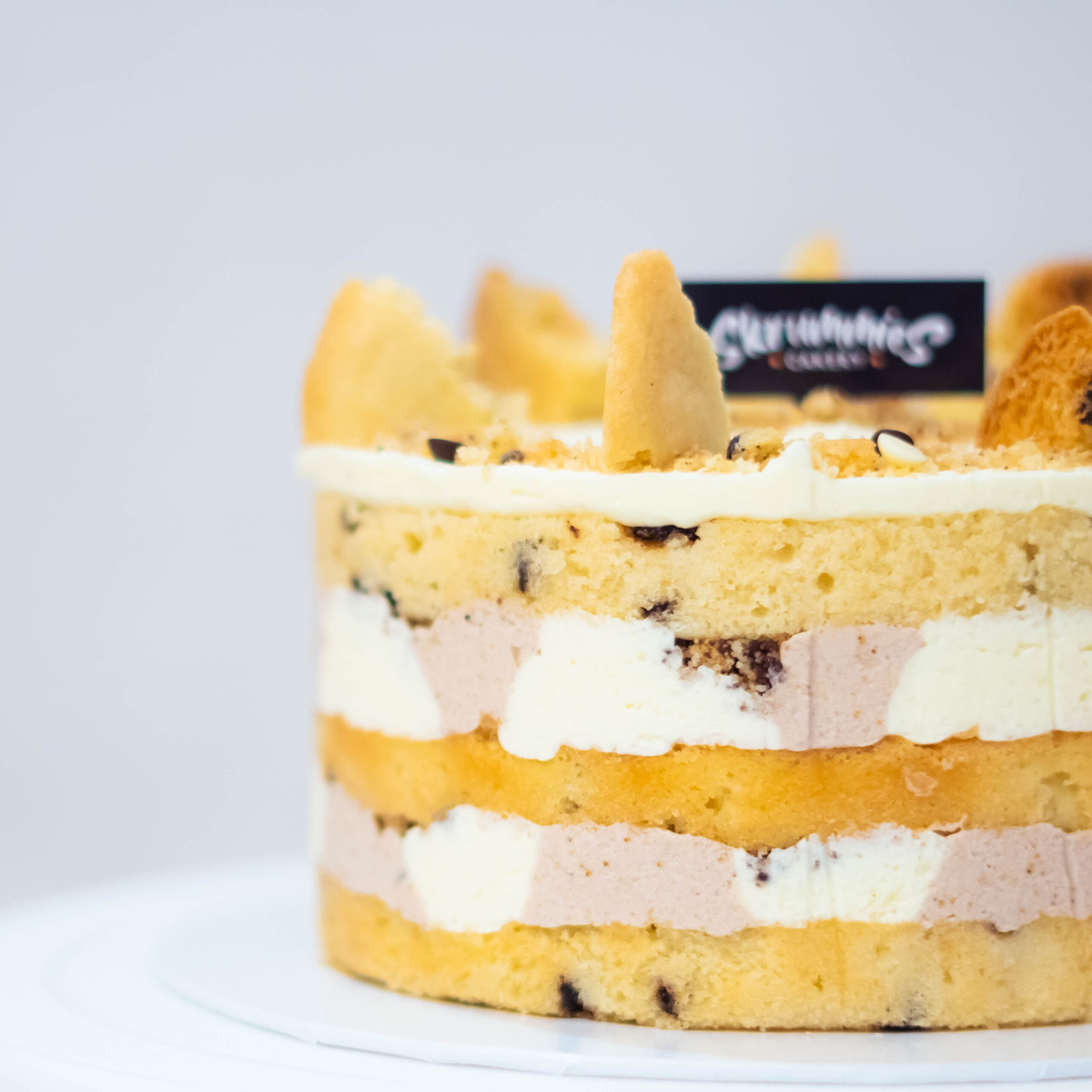 This cake has everything in it… everything but the kitchen sink! First, we layer soft chocolate sponge with choc buttercream and choc custard, then fill with all the treats we love! Brownie chunks, crunch pie, Dream Bar, lashings of salted caramel sauce, a good helping of digestive crumb and a scattering of white chocolate crispy pearls. We finish this one off with chocolate sauce, more digestive, and crown it with all those chocolate goodies! A slice of this is irresistible.