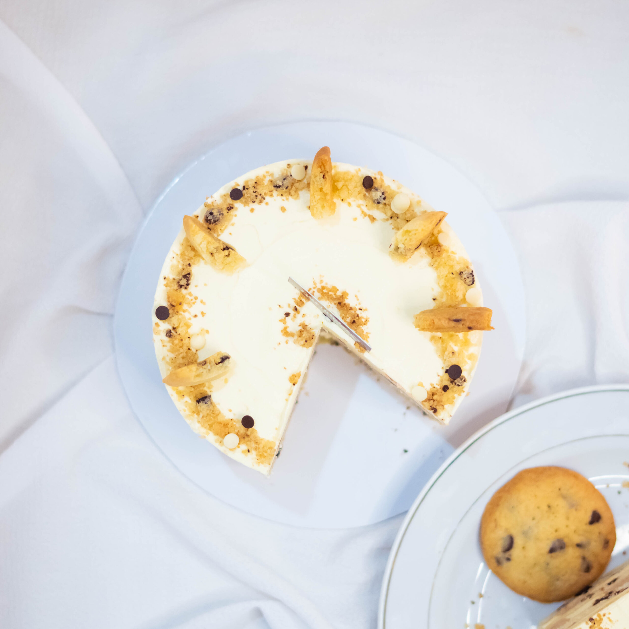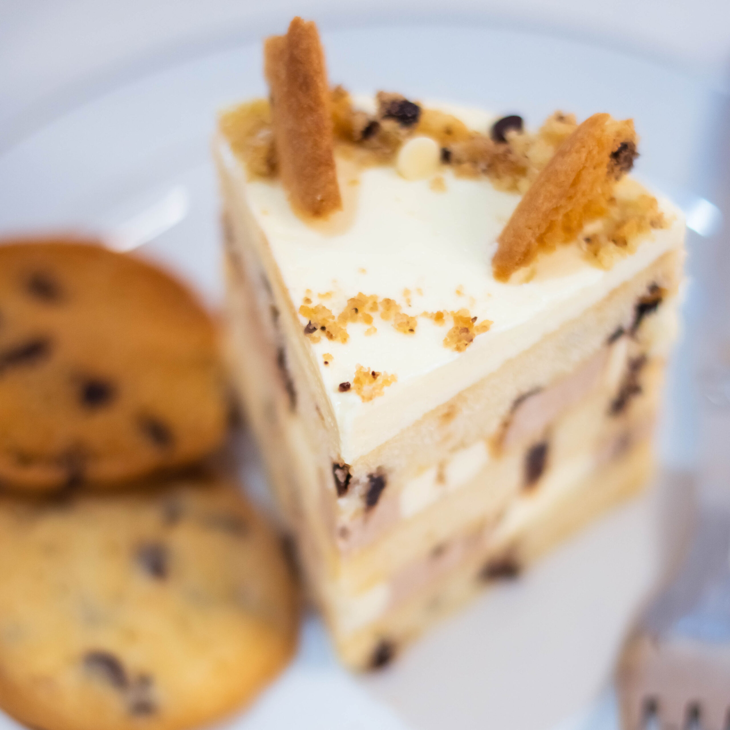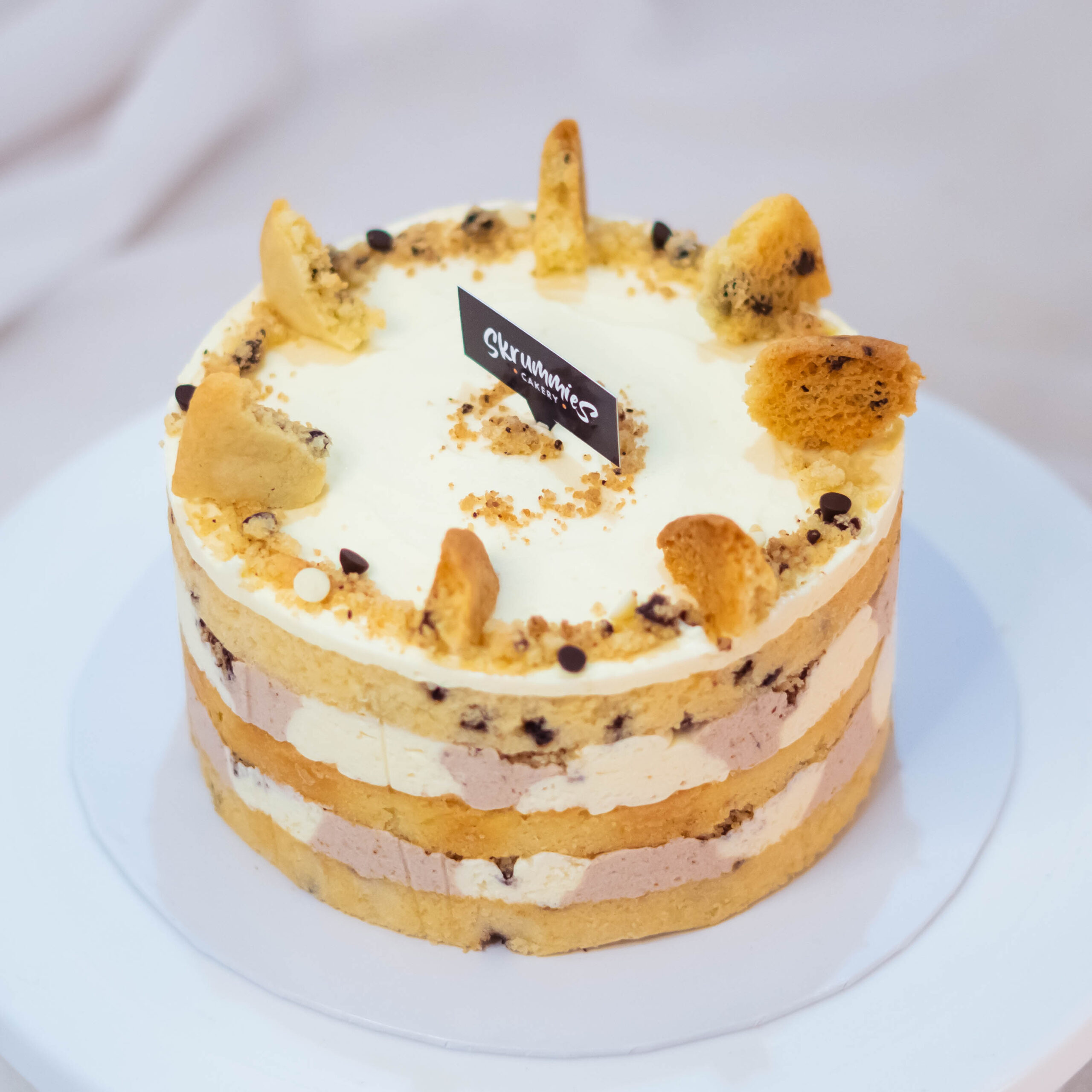 This cake has everything in it… everything but the kitchen sink! First, we layer soft chocolate sponge with choc buttercream and choc custard, then fill with all the treats we love! Brownie chunks, crunch pie, Dream Bar, lashings of salted caramel sauce, a good helping of digestive crumb and a scattering of white chocolate crispy pearls. We finish this one off with chocolate sauce, more digestive, and crown it with all those chocolate goodies! A slice of this is irresistible.